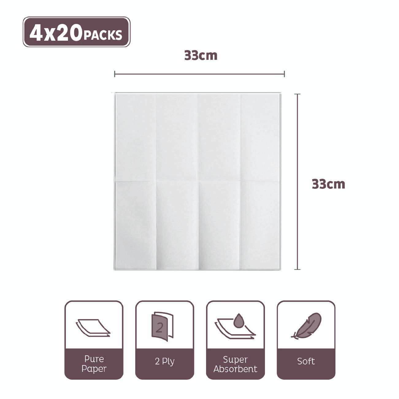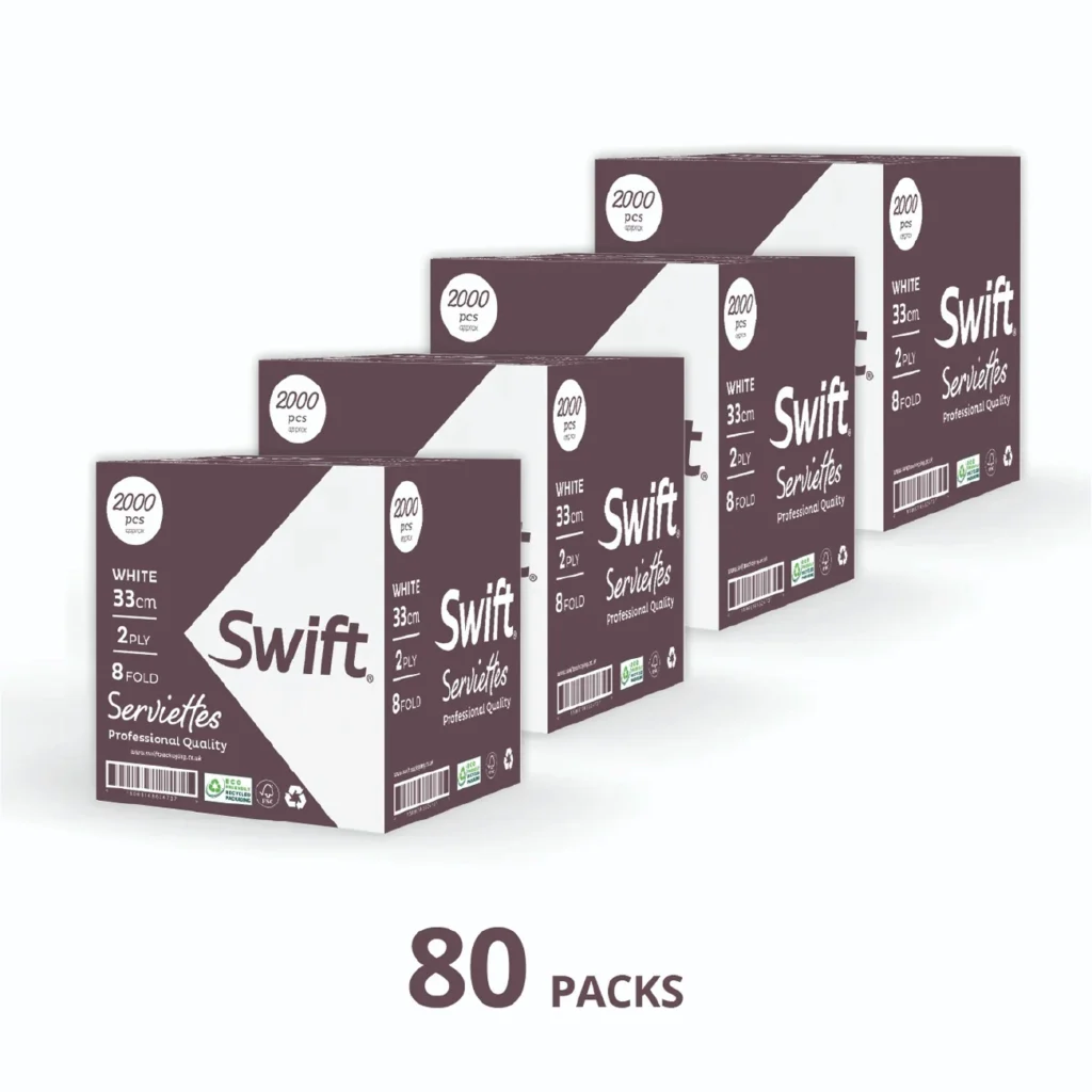 Swift 33cm 2-ply serviettes bring softness, strength, and sustainability to your table. Crafted from pure, responsibly sourced paper, they are perfect for family dinners, birthdays, and casual gatherings. Their 8-fold design not only looks neat on any table setting but also opens up to a generous size when needed, offering both convenience and comfort. With recyclable packaging, they make every occasion feel special while keeping eco-conscious choices at heart.