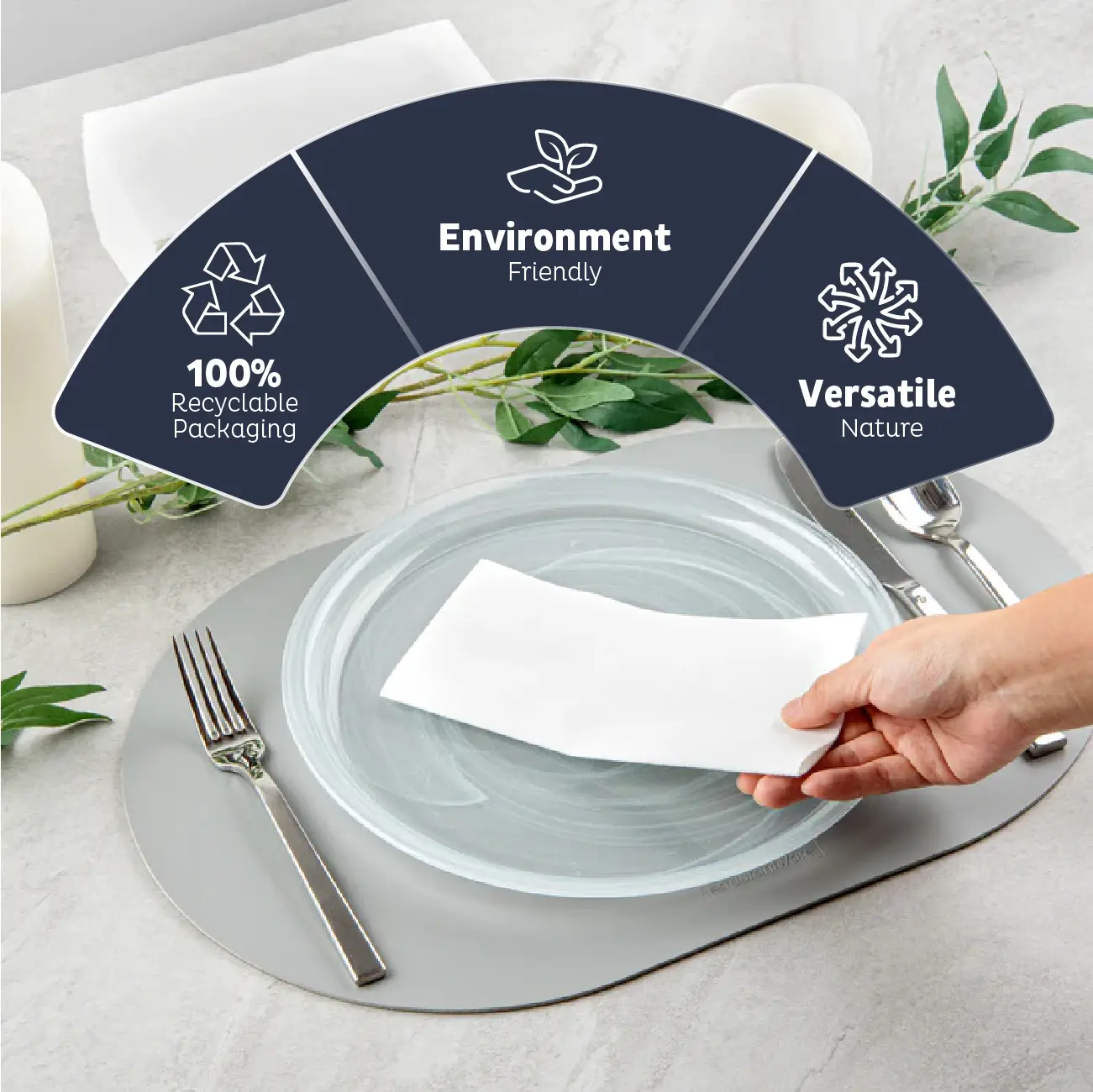 For a touch of everyday luxury, Swift 40cm 2-ply serviettes are made from pure, sustainably sourced paper and packaged in 100% recyclable materials. Their extra-soft, absorbent design makes them perfect for sit-down meals, dinner parties, or special occasions at home. With a convenient 8-fold format, they bring elegance to your table setting and unfold to full coverage when needed, offering the ideal balance of style, practicality, and eco-friendly living.