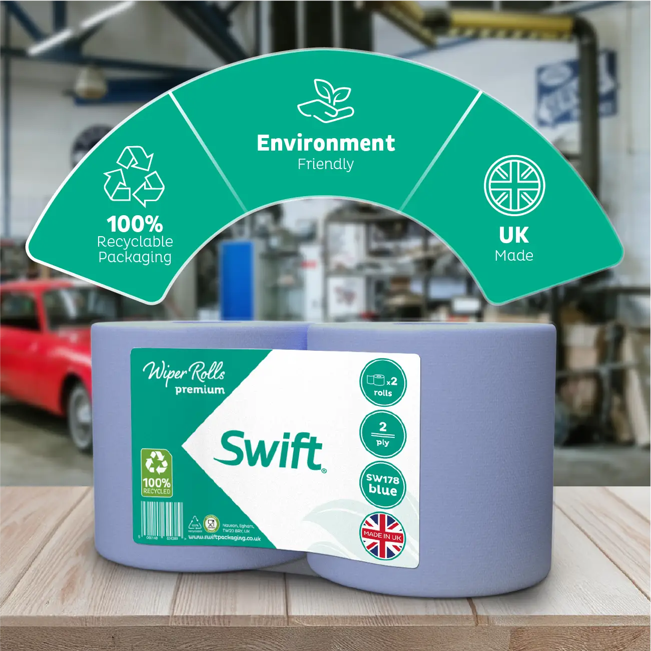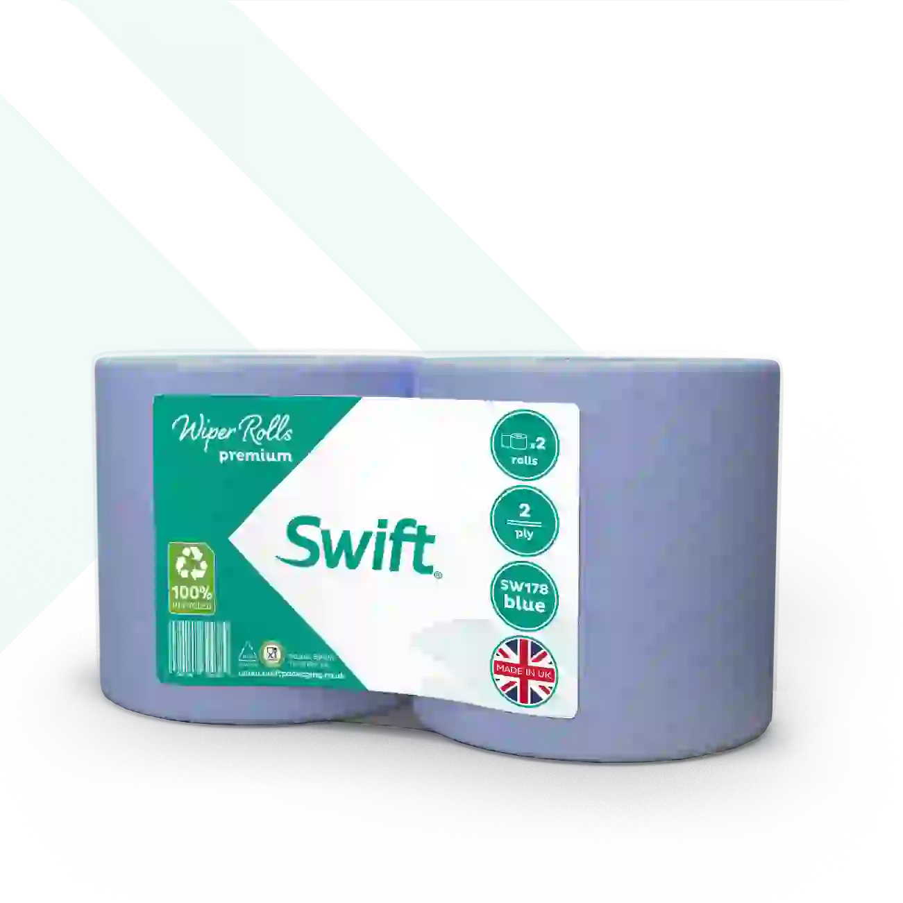 Engineered for the demands of manufacturing environments, Swift’s Premium Blue Wiper Rolls deliver fast, effective clean-ups where performance matters. Whether absorbing oil, grease, or water, the high-capacity 2-ply sheets provide excellent absorbency and remain strong even when wet.